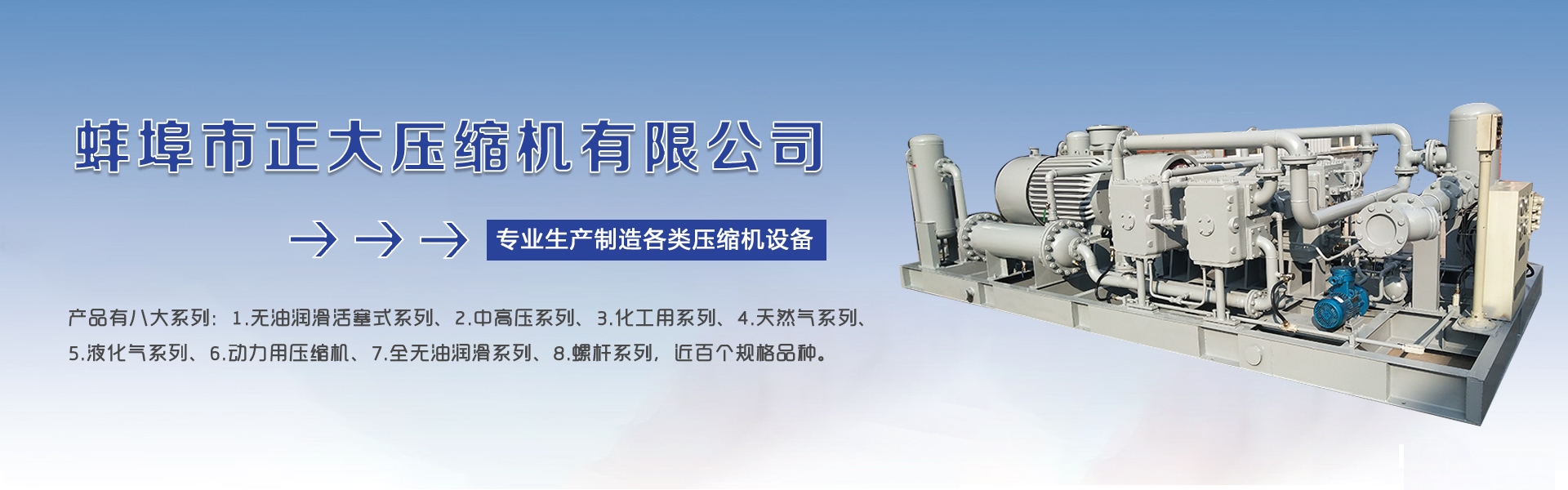 蚌埠市正大壓縮機有限公司是專業生產制造各類高、中、低壓氣體壓縮機設備的企業。公司現擁有大型的生產制造車間,一批專業的高級技術工程師人員隊伍,嚴格的產品檢測設備,按照ISO9001:2000國際質量體系控制產品質量。產品有八大系列:1.無油潤滑活塞式系列、2.中高壓系列、3.化工用系列、4.天然氣系列、5.液化氣系列、6.動力用壓縮機、7.全無油潤滑系列、8.螺桿系列,近百個規格品種。產品排氣量0.2-40m3/min,排氣壓力0.2-35MPa。所生產的空壓機產品廣泛適用于城市建設、石油化工,煤炭、地質、冶金、制藥、液化氣站、油氣庫碼頭等部門,可壓縮:天然氣、空氣、氮氣、煤氣、二氟乙烷、二氧化碳、乙烯、丙烯、氯乙烯、二甲醚、液化氣、礦井氣、沼氣、氧氣、氫氣、氨氣、一氧化碳等各種特殊氣體。業務遍及安徽蚌埠、柳州、湖南、河南、江蘇、山東、四川等地。